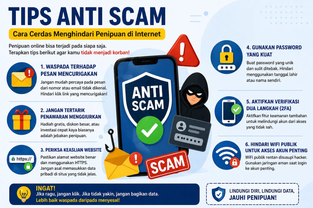 Jangan pernah login ke akun penting menggunakan perangkat umum atau jaringan Wi-Fi publik tanpa perlindungan. Hal ini dapat meningkatkan risiko pencurian data.